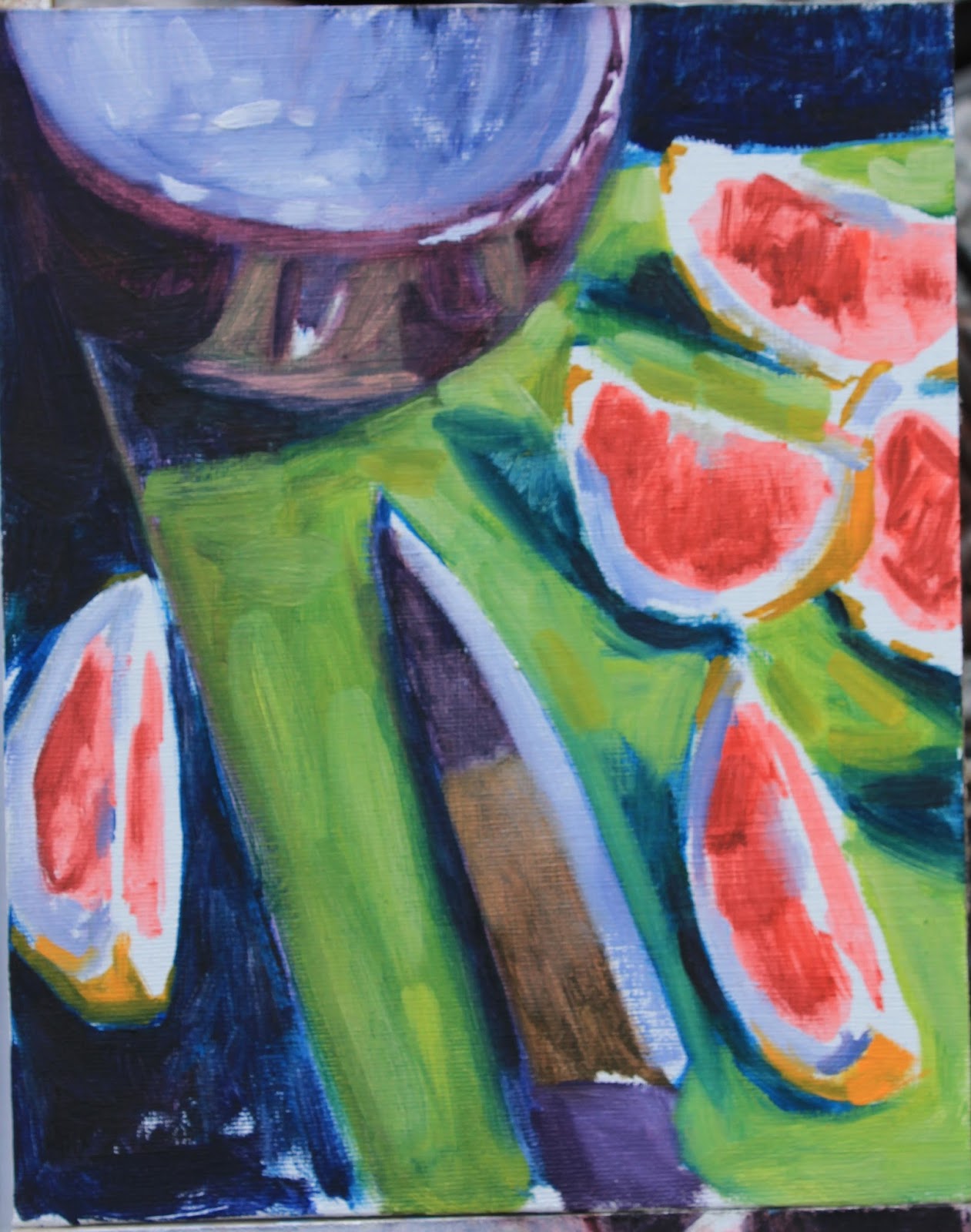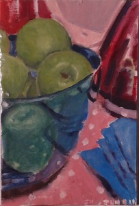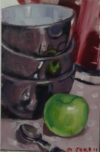 Still Life A Bowl of Apples 8 inches x 6 inches, oil on Reeves canvas board Grapefruit Diet 2 10 inches x 8 inches, oil on canvas board Available 3 Bowls, a Spoon and an Apple 8 inches x 6 inches, oil on Reeves canvas panel Available Share this: Click to share on X (Opens in new window) X Click to share on Facebook (Opens in new window) Facebook Like Loading...